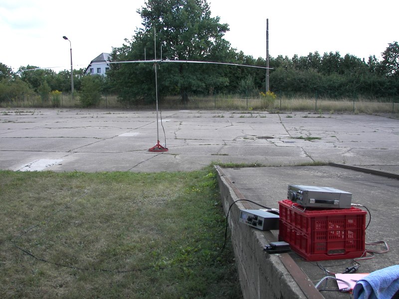 Mein Versuchsaufbau. Die Antenne ca. 2,5 m über Grund. Mir ging es hier erst einmal nur darum zusehen, ob sich alle Bänder von 20 - 10 m abstimmen lassen. Aber alles im Lot alle Bänder ließen sich problemlos anpassen. Auf 15m hörte ich ein paar Conteststationen und konnte gleich einmal die Richtwirkung probieren. |